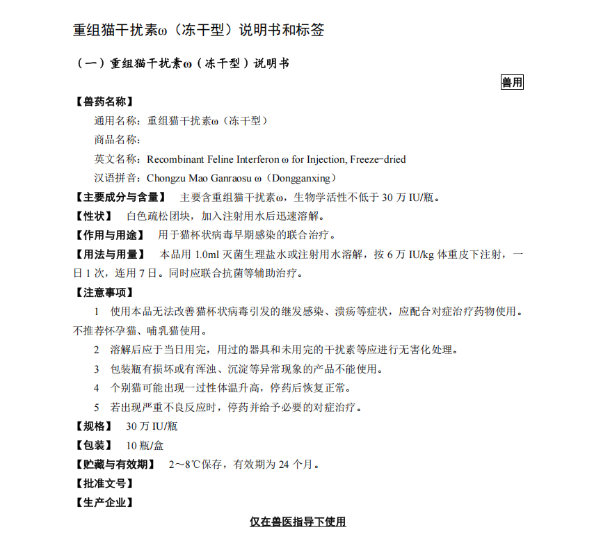 重组猫滋扰素ω(冻干型)